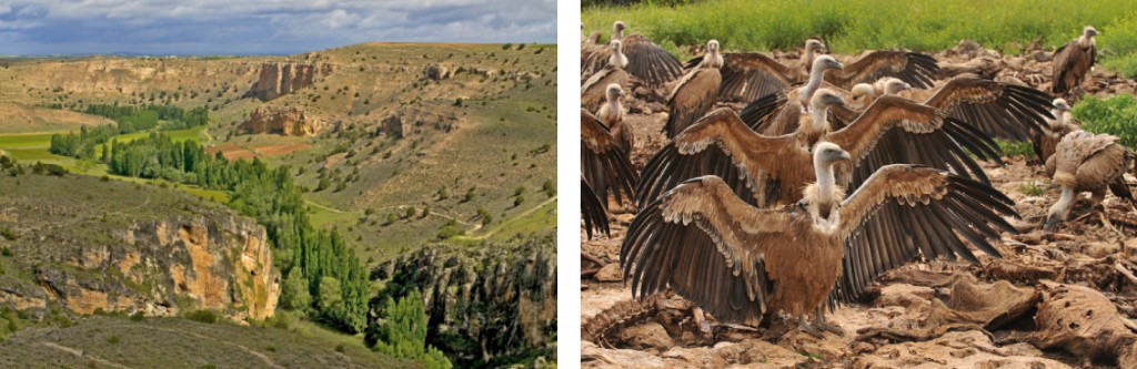 Panorámica de las hoces del río Riaza, con los cortados de Peña Portillo al fondo, y grupo de buitres leonados en un comedero (foto: Jorge Sierra / WWF España).