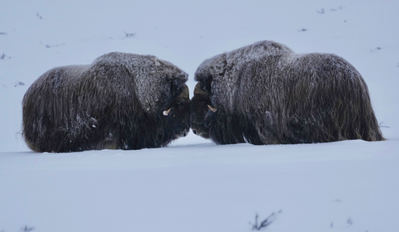 | | Combate entre machos de buey almizclero en el Parque Nacional de Dovrefjell (Noruega). Foto: Frederic Ferrando. |