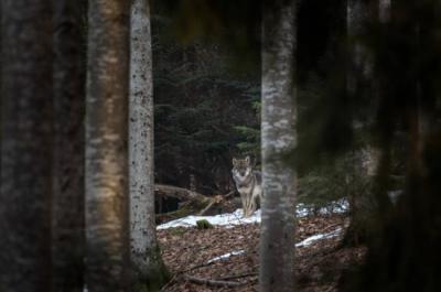 | | Lobo en un bosque del sur de Alemania durante el invierno (foto: prochym / Adobe Stock). |