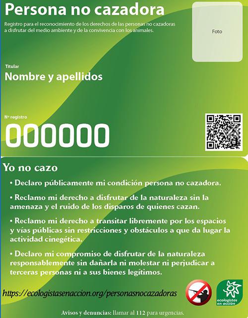 Para solicitar el carnet de persona no cazadora hay que inscribirse en un registro y enviar una foto. A partir de ahí se facilitarán las instrucciones pertinentes para emitir y enviar el documento a quien lo solicite. Para recibir el carnet no hace falta ser socio de Ecologistas en Acción. La emisión del carnet es gratuita. Más información, en www.ecologistasenaccion.org/personasnocazadoras