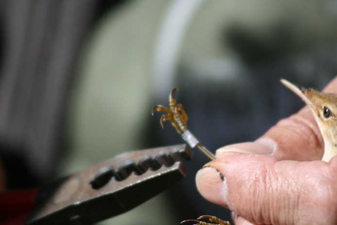 Carricero común en el momento en el que lo están anillando.