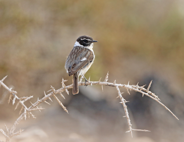 Macho de tarabilla canaria posado en una rama de espino de mar (Lycium intricatum) (foto: Christoph Moning).