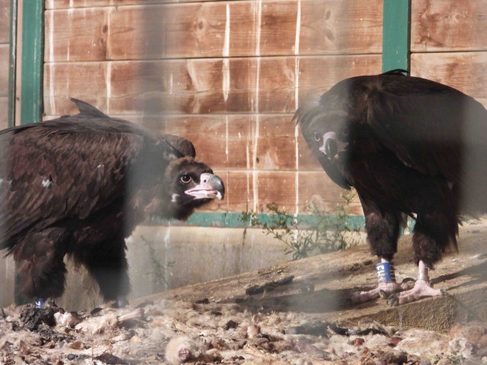 Dos buitres negros en el jaulón de aclimatación construido en Els Ports.