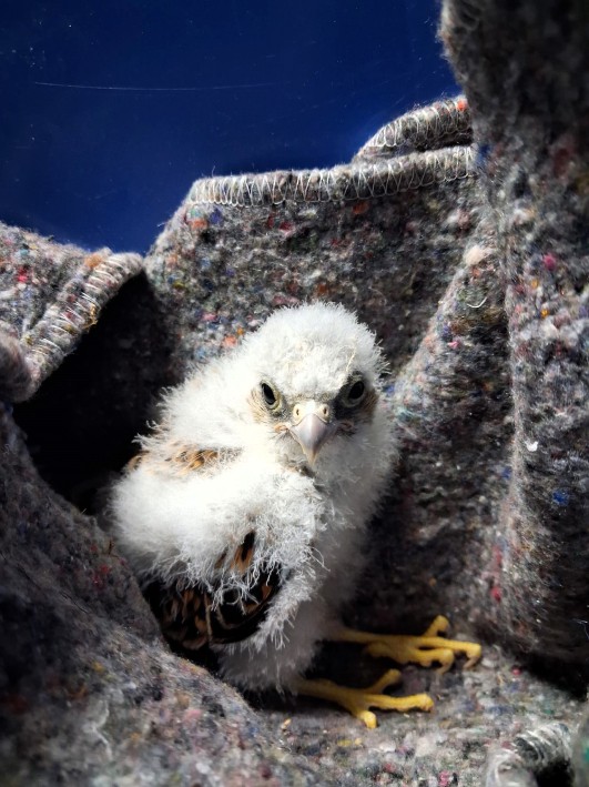 Pollo de cernícalo primilla rescatado tras caer de su nido.