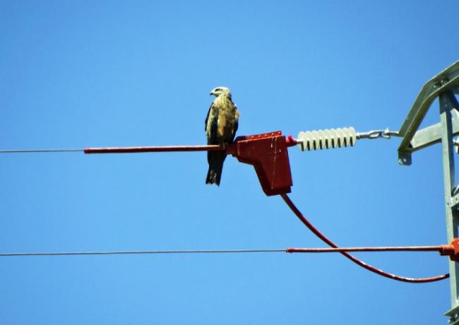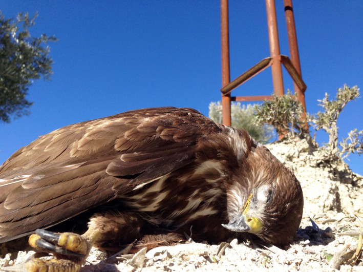 Un ratonero electrocutado yace junto al apoyo de un tendido eléctrico.