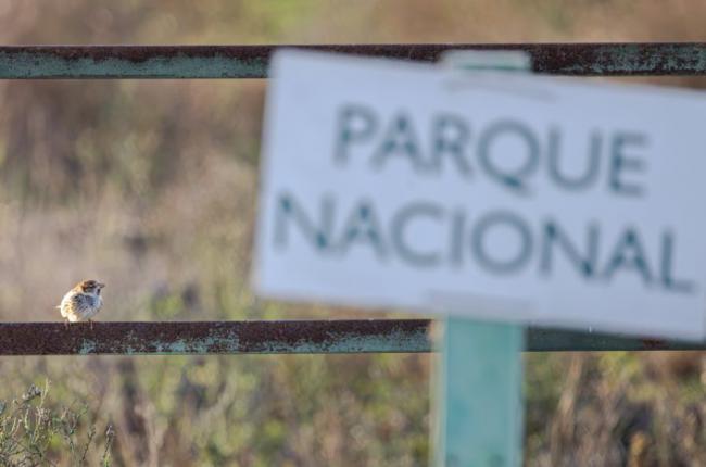Gorrión moruno posado junto a un cartel indicativo del Parque Nacional de Doñana (foto: Jacinto Román).